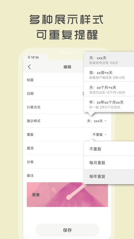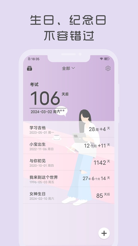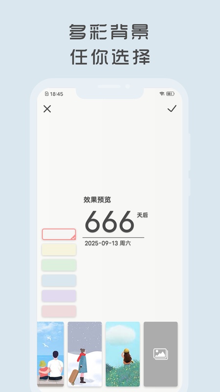 以时光的记录与提醒为核心,强调对过去时光的纪念和未来时光的倒数。卡片设计简洁美观、简单易用,能让用户用碎片时间抓住时光的每个动情片段。通过设置不同的时光记录项目,如向她告白的天数、亲人的生日倒数、自身的生活天数统计、考试的倒数等,满足用户多样化的需求。背景图选择丰富,可自定义,增加了应用的个性化。