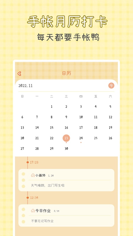 4、 原创手帐月历功能。月历视图清晰明了,精准查看每一天的日记,不漏任何一天。