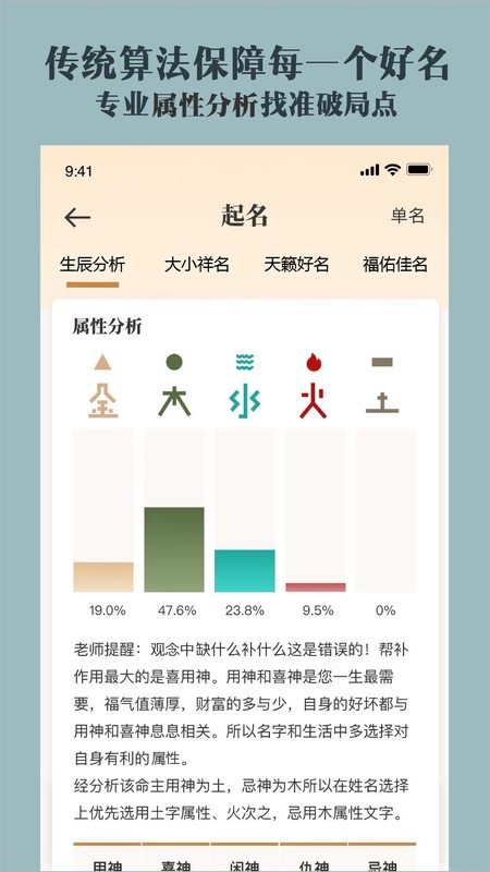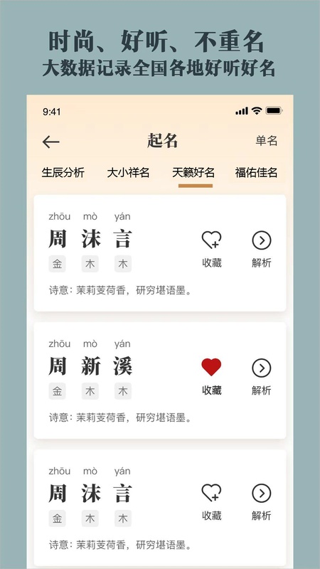 天籁好名:通过大数据分析,大部分用户认为好听的名字,兼顾属性搭配助力。
