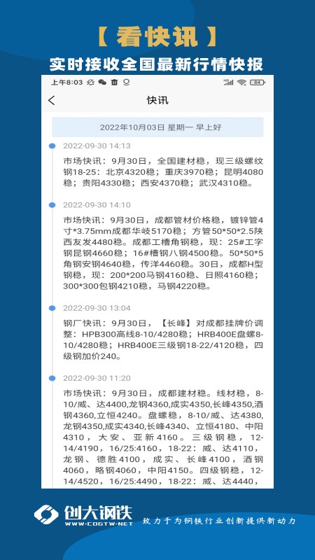 增加消息推送功能,可实时推送接收最新的钢材行情快讯。快讯内容包含:钢厂调价、市场调价、城市库存、指数变化、钢坯、铁矿石、国内外快报等内容