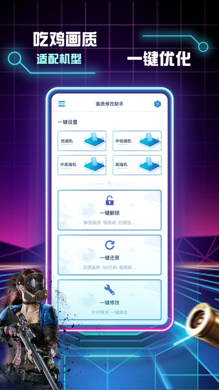 该软件可对手机吃鸡游戏进行画质修改和优化,能够根据代码设置游戏性能,优化游戏性能,让游戏运行更加流畅。它能提升低端机性能,解决低端机卡帧问题,也能让高端机适配更高画质,稳定帧数,发挥最大性能。软件还可优化加速性能,实现加速开镜、加速开枪,使操作更加流畅。此外,它能提升游戏帧率,提高画质至高清级别,拥有画质助手功能,帮助玩家成为游戏高手,提升开镜速度,让开枪快人一步,使瞬狙等操作更加顺畅,减少不必要的性能损耗,用代码拯救游戏卡顿问题。