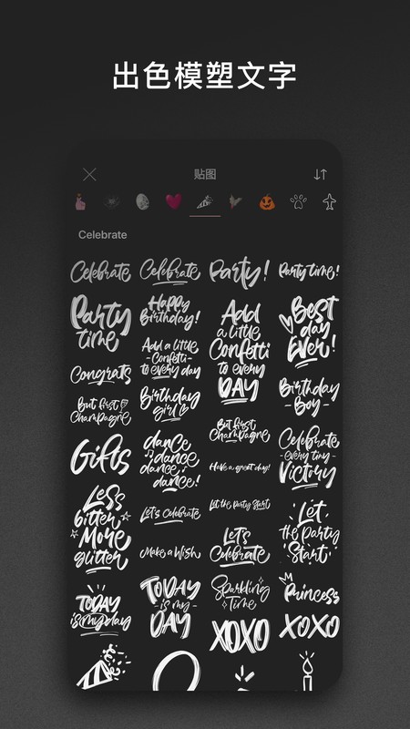 可从不断补充的贴图套中添加免费现成题词,或用应用程序中的多种字体(部分支持西里尔文)制作自己的文本。能使用现成的完全可编辑模版快速开始项目,也可创建自己的模版,还能删除、交换位置和复制模版。