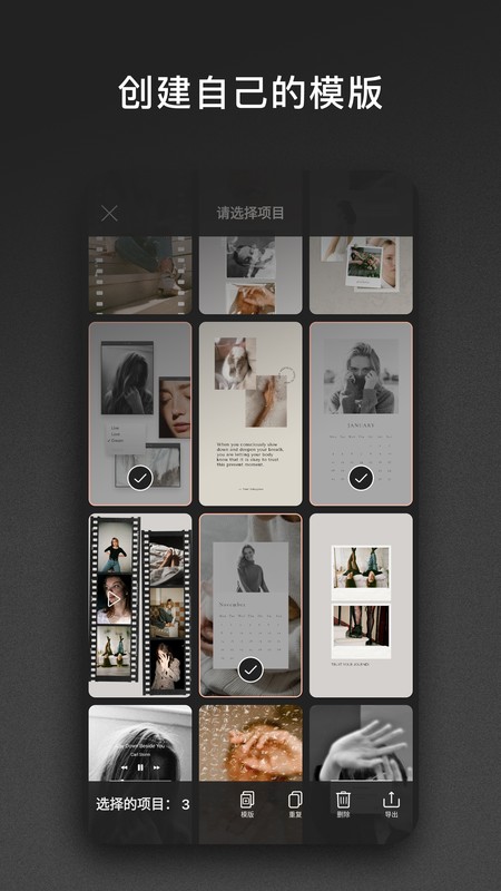 找到你独特的风格,保存拼版画、计划你的消息流。现在,可以更快地创建美丽的限时动态!可以删除模版,交换其位置并复制!创建一个模板,并多次复制。
