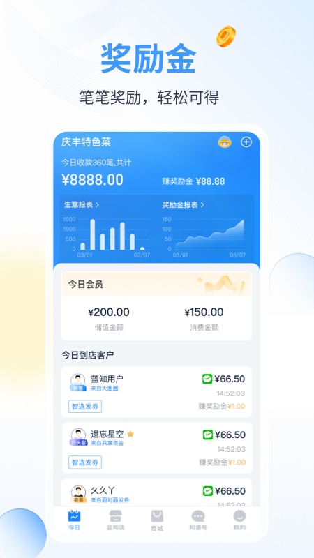 蓝知APP是为商户提供的集二维码收款、客群管理、经营营销等场景化应用的异业联盟平台。改变原有线下门店与客流之间的松散关系,实现不同门店间的客流共享,让门店更好的掌控自己的私域流量。轻松安装,聚力共赢。