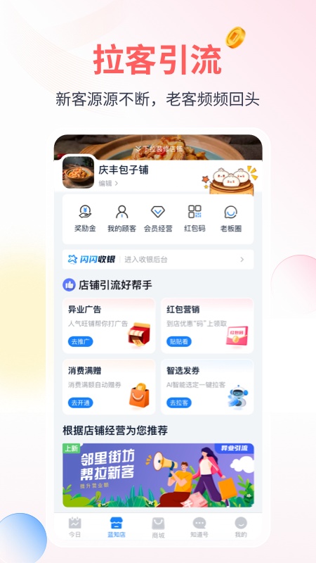 蓝知APP是一个集二维码收款、客群管理、经营营销等场景化应用的异业联盟平台。它改变了原有线下门店与客流之间的松散关系,让门店可以更好地掌控自己的私域流量,实现不同门店间的客流共享,并且安装轻松,能助力商户聚力共赢。