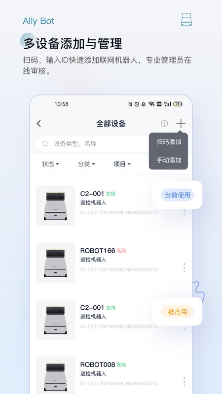 ♦\t多设备添加与管理——扫码、输入ID快速添加联网机器人,专业管理员在线审核。