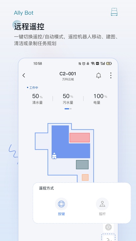 AllyBot App具备多设备添加与管理功能,可通过扫码、输入ID快速添加联网机器人,且有专业管理员在线审核。它支持洗地吸尘一体,有洗地、吸尘两种清洁模式,还有静音、标准、强力和最大四种强度调节。用户能随时掌握设备状态,远程查看机器人在线/离线、工作/空闲、异常、充电等多种实时状态。