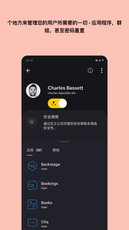 1.\t用户管理:管理员可以直接在手机中添加用户,并为这些用户分配应用、角色和组。
