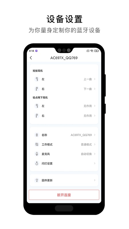 4. 耳机功能设置(耳机快捷操作的指令设置,设备OTA固件升级,工作模式选择,设备重命名,耳机麦克风喜好设置)。