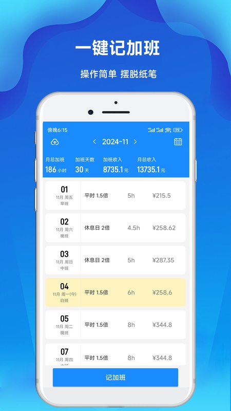 一键记加班,精确记录每天加班时间,自动计算加班工资,让您随手记工资天天记加班记录,还能自动生成加班日历。