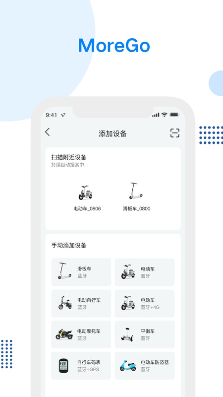 MoreGo 支持多种智能出行设备,包括滑板车、电动车、自行车码表、电动车防盗器等,满足您多样化的出行需求。