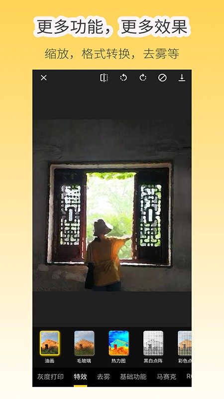 特效功能提供油画、毛玻璃、热力图、黑色点阵、彩色点阵、反色等特效。