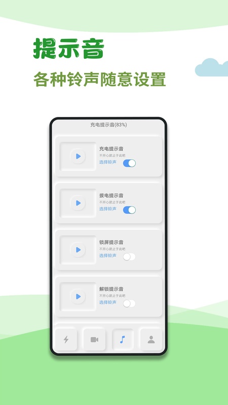 1、充电提示音、拔电提示音、锁屏提示音、解锁提示音、电量充满提示音、低电量提示音,铃声多多,随意设置;
