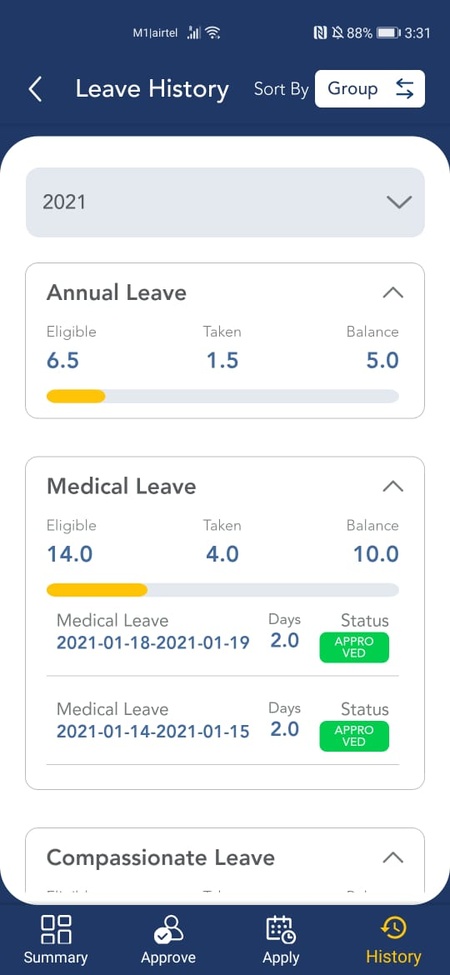 Once the employee applied for a leave, real-time push notification & an e-mail alert will be sent to the approving officer Mobile App. Once the leave has been approved/rejected by the officer, real-time push notification & an e-mail alert will be sent back to the employee as well.