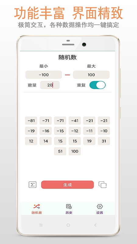 - 自由生成随机数字,功能性实用性俱佳,是大家学习生活工作的实用工具!