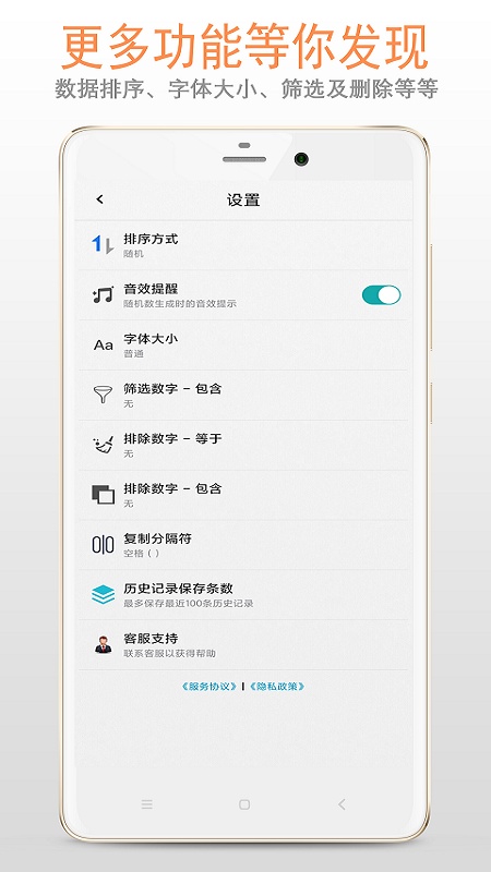 5、其他特色功能:文字大小、复制分隔符设置、音效设置、筛选与排除功能、数据历史记录等。 应用功能