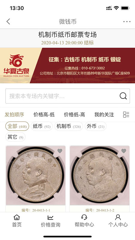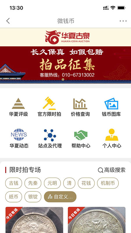 微钱币是华夏古泉(北京)网络科技有限公司提供在线拍卖服务程序,用户通过app更好的使用我们提供的在线服务.华夏古泉(北京)网络科技有限公司是专业的古钱币,机制币在线交易服务平台. 应用功能