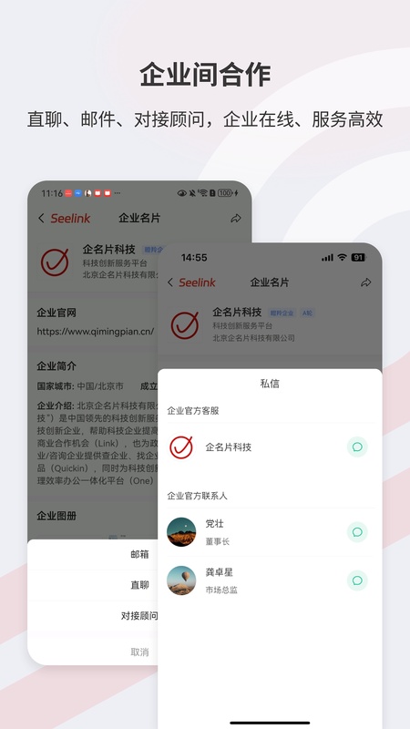 Seelink - 企业间合作平台核心定位为“看企业新闻、查企业联系企业、认识更多新朋友”,聚焦职场商业背景下的人脉拓展、商务社交和企企合作。以商业内容和数据为基础,开展群组交流、圈子话题、校友互动等活动,汇聚高品质商业群体,传递职场/行业优质观点,致力于打造中国人的linkedIn++。