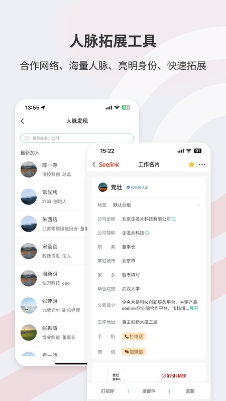 Seelink-企业间合作平台,以 “看企业新闻、查企业联系企业、认识更多新朋友”为核心定位,助力职场商业背景下的人脉拓展、商务社交、企企合作,以商业内容和数据为基础的群组交流、圈子话题、校友互动等,汇聚高品质商业群体、传递职场/行业优质观点、致力于打造中国人的linkedIn++。