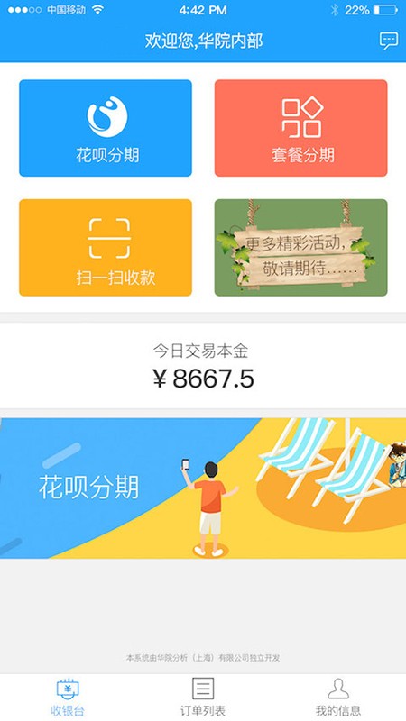 优享花,原U享收银台,为华院分析技术(上海)有限公司研发的,一款用于商家、门店线下购物收款用App,为商户门店的销售管理,账务管理等需要提供技术支持 软件功能