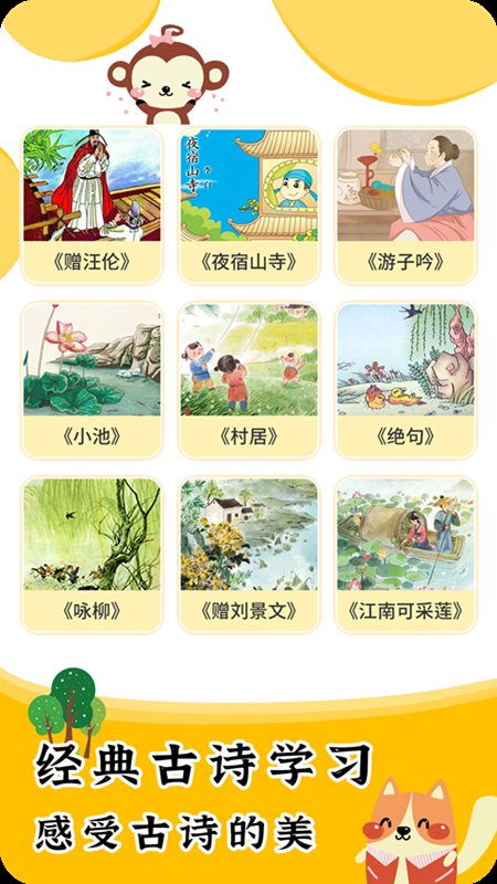 3、宝贝学古诗:精选幼儿必读经典诗词,配有精美场景和专业朗诵示范,让孩子爱上古诗。