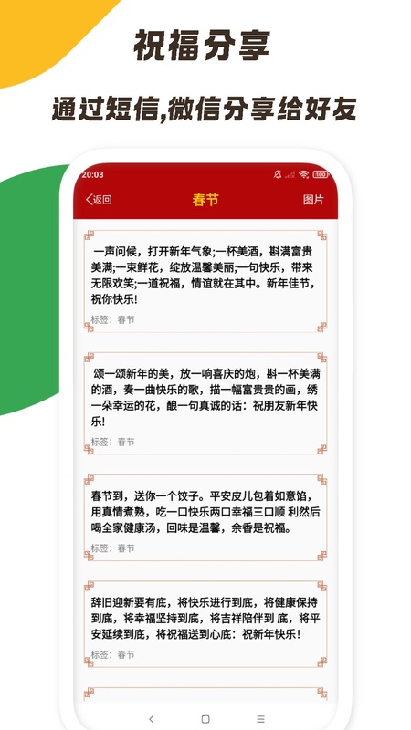 这款应用很好地传承和发扬了中国历史悠久的祝福文化,在现代生活中为人们提供了便捷的祝福方式。它既保留了传统节日祝福的内涵,又结合了现代技术手段,满足了人们快节奏生活下的祝福需求。多样化的节日覆盖和丰富的祝福内容,让用户能够轻松地为亲朋好友送上贴心的祝福,是一款实用且有意义的应用。