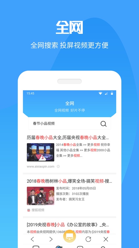 全网:可搜索网上视频,搜索的同时会检测到视频,只需点击投屏按钮即可大屏幕观看,支持各大视频网站,只要你能搜出来,我们就能投!