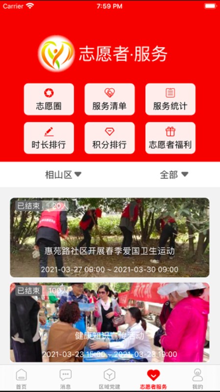 针对志愿者活动,提供报名、参加渠道,能获取积分并进行福利兑换,激励党员积极参与志愿服务。