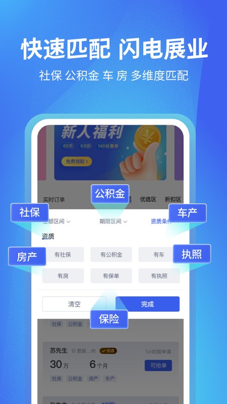 闪电展业为信贷经理提供多种客户申贷渠道,涵盖信用贷、抵押贷、车贷、社保贷、保单贷等。具备海量订单,通过大数据智能筛选,确保订单信息真实有效。还有人工核查需求,保障客户真实可信,每日推送大量优质订单。