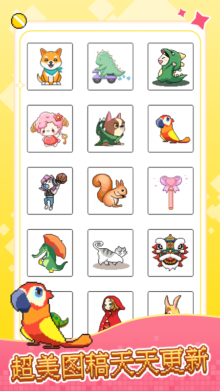 图稿数量众多,涵盖二次元人物、动漫角色、漫画主角、游戏人物、明星爱豆等各种类型,能满足不同玩家的需求。并且每日会更新全新的精美像素图画,玩家完成涂色后还能与好友分享佳作。