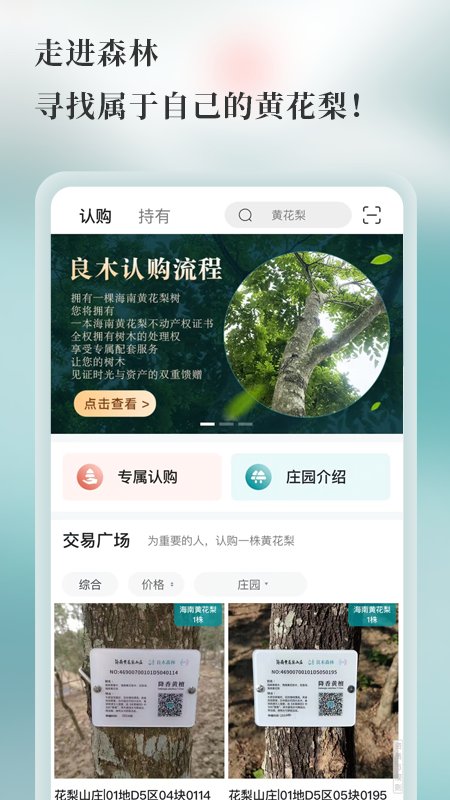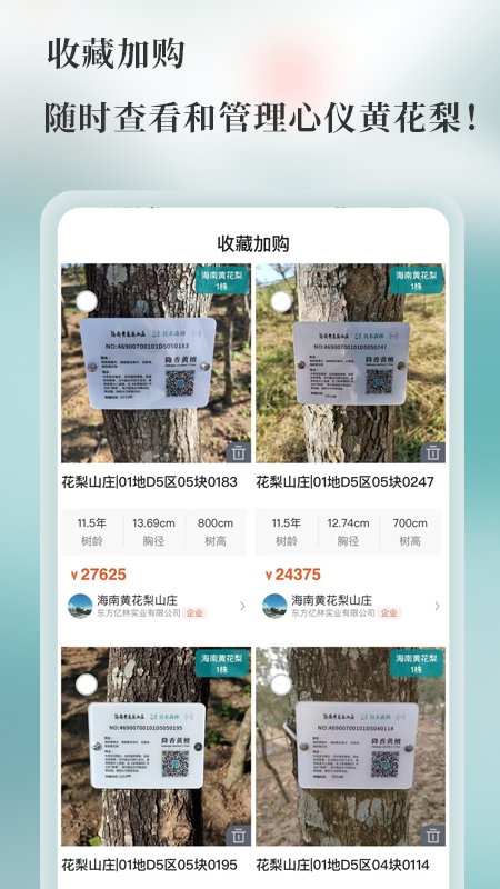 作为专业的林木交易平台,涵盖了海南黄花梨交易的全流程环节,为每株林木提供数字化身份确权。有第三方专业林木管理公司为用户的树木提供科学养护和安全看护,让用户管护无忧。强调绿色权益可百年传承,能满足用户为爱情、孩子、自己、长辈种树等不同需求,见证生活中的重要时刻。