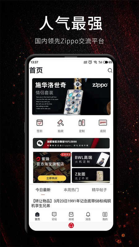 紫锋Zippo爱好者的聚集地 ,17年历史沉淀国内老牌Zippo爱好者必备社交App,最专业的Zippo文化资讯,志同道合的Zippo爱好者,Zippo知识问题答疑解惑,Zippo拍卖转让求购人气最旺的交流平台。 软件功能