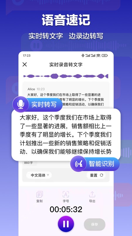 支持录音实时转写和语音即时转文字,适合会议速记、学习笔记等,快速提高工作学习效率