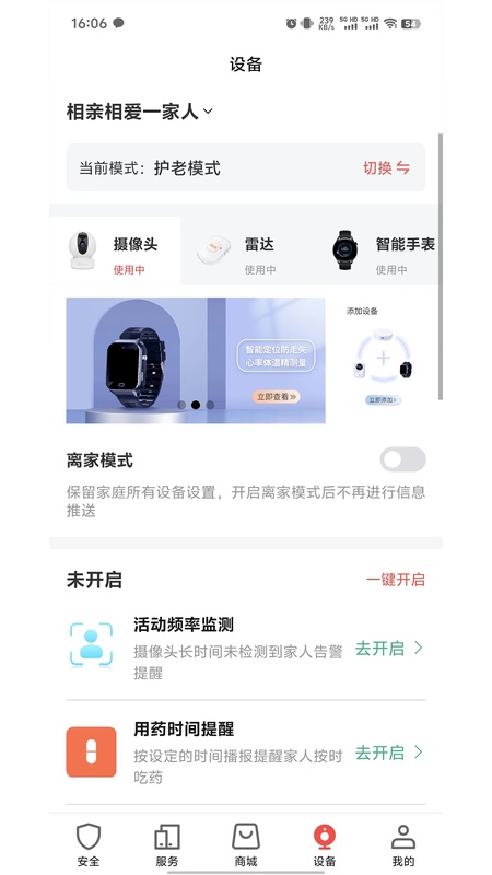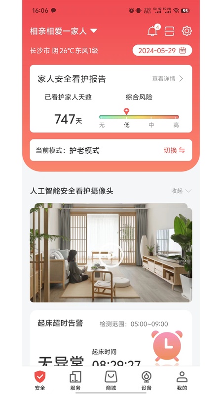 居嘉卫士”是一款专门用来看护生命安全的产品。针对在外务工的子女不在家人身边,或无法24小时陪伴家人的家庭而研发,目的是为解决中国老人社会看护的问题,其核心逻辑是利用物联网+人工智能AIOT系统等先进技术帮助子女时刻看护老人生命安全。不但对于失能或者半失能的老人看护有效,对于60岁以上的老人,更有防范于未然的作用。总之,居嘉卫士APP具有很强的社会意义! 软件特点