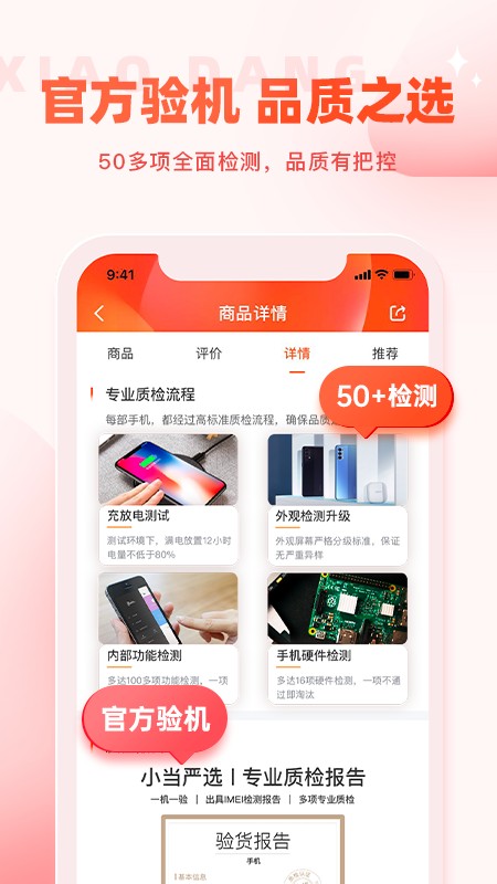 小当严选app主打经营9成新及以上各种型号的二手手机、ipad、笔记本、智能手表、蓝牙耳机等3C数码电子产品。具备一物一验、专业质检功能,专业工程师进行50项严格质检;提供官方保障,全程服务,顺丰包邮,专业包装与运输保障手机安全;支持7天无理由退货,一年质保,部分商品保价10天。还有小当优品板块,官方优质二手商品坚持每天上新,有每日秒杀活动。