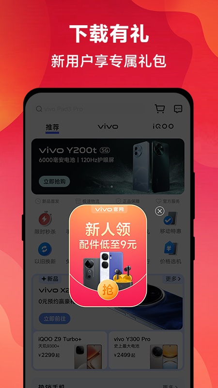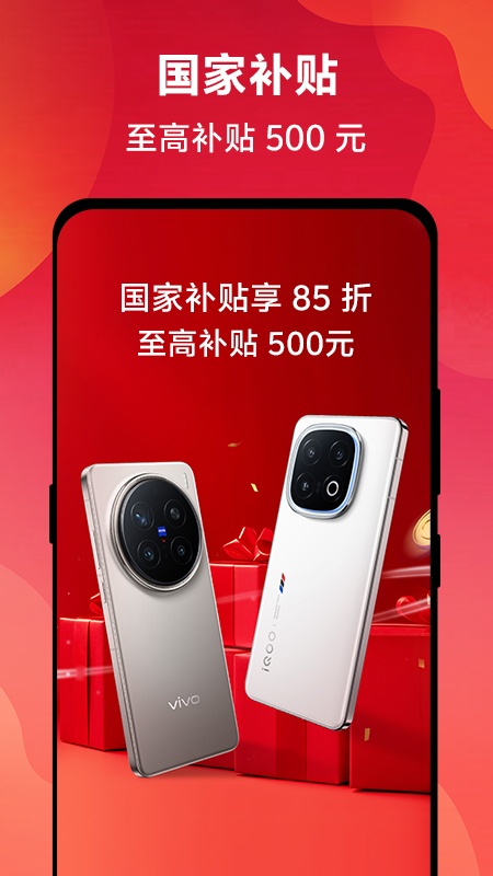 国家补贴享85折,至高补贴500元。有新品首发活动,X200系列、S20系列、iQOO13系列、iQOO Neo10系列新品首发可抢购。还有新人专属礼包,包含手机和配件。多款vivo、iQOO手机和配件价格直降。抢购频道精选好物,享5折秒杀。
