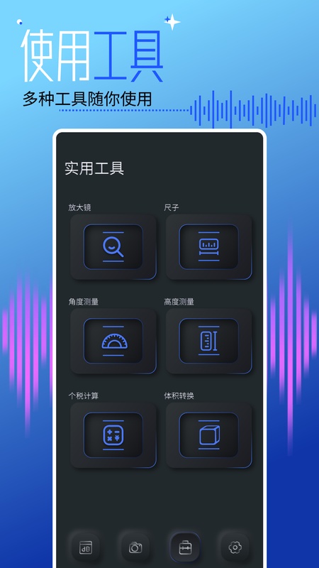 这款软件功能丰富且实用,分贝测试功能有助于用户了解环境音量数据,保存历史数据方便后续对比分析。分贝相机满足了用户在拍摄时对环境音量的好奇。多样化小工具可满足日常生活中的各种测量需求。而且能实时实地测量环境噪音大小,提醒用户关注过大噪音对身心健康的影响,值得大家下载使用。