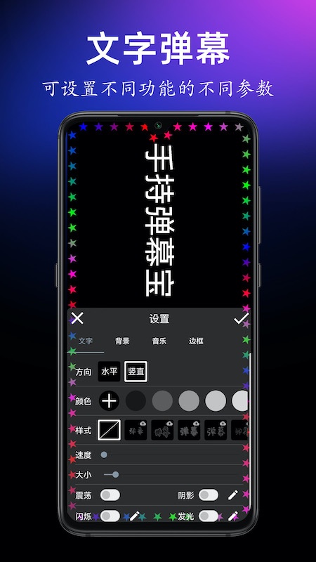 文字弹幕功能丰富,可设置文字滚动方向、速度、闪烁及左右震荡,还能设置字体的颜色、样式、大小、阴影及发光;能将背景设置为纯色、图片或者视频;支持播放背景音乐;可根据编辑后的屏幕形状,播放多种边框动画和挖孔屏动画;还支持通过自定义编辑的模板发送弹幕。