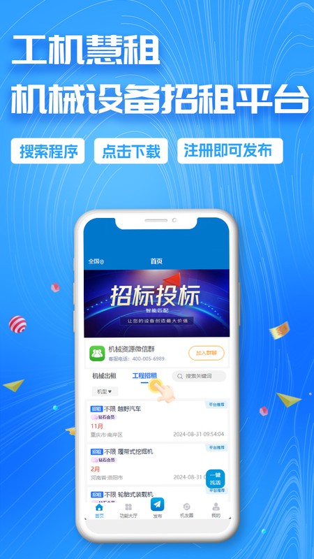 “工机慧租”智慧租赁系统,通过互联网服务于建筑企业与机械设备主,可在平台内发布工地信息或机械设备,供用户进行抢活或租赁。给企业提供专业的税务筹划,帮助机械设备主降低机械闲置率。目前服务范围辐射工程机械在线租赁、调配和管理、劳务系统、规范化的履约、结算和纳税以及金融和保险等增值服务。 功能特色