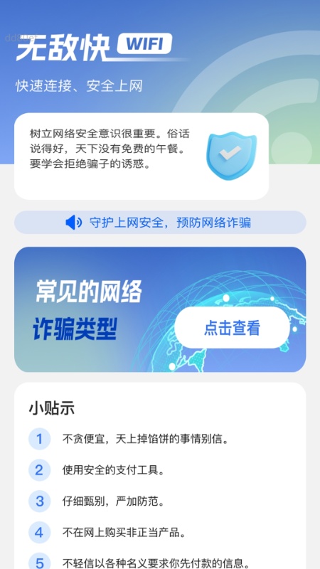 无敌快WiFi为用户提供了全面的网络支持,且免费下载使用。其丰富的功能能够满足用户在上网、安全防护以及健康管理等多方面的需求,让用户的生活更加方便与安全,值得广大用户尝试使用。