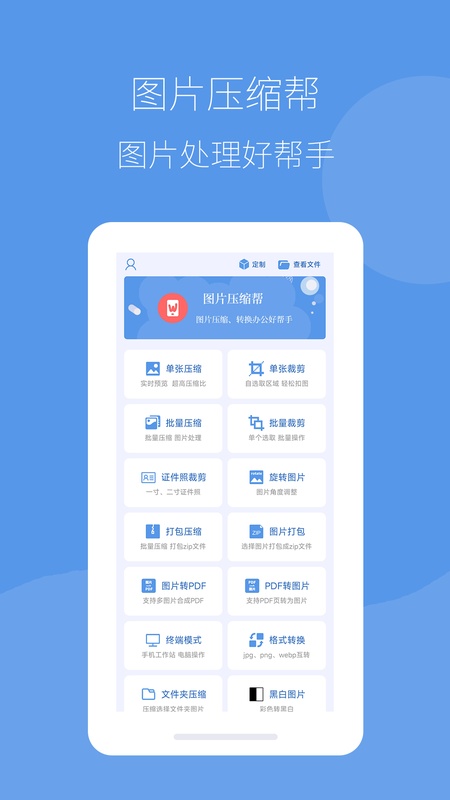 图片压缩帮能解决各类图片问题,具备图片批量压缩、裁剪、证件照裁剪、图片旋转、PDF转换、图片格式互转、黑白图片转化等功能。支持批量压缩相册照片并打包成zip,批量裁剪照片且支持智能选区,能进行证件照尺寸裁剪(300dpi),轻松裁剪一、二寸大小。还可将多张图片转为单个pdf,或把PDF页转为图片。同时支持文件夹压缩,一键选取压缩整个文件夹的图片,可处理10000张图片。此外,支持电脑互传,输入ip地址就能在电脑和手机间轻松互传图片,也支持旋转图片、一键转化为黑白图片,以及jpg、png、webp格式间的转换,还支持终端模式,让电脑也能操作图片处理。