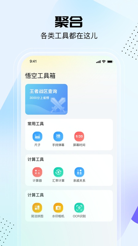 悟空工具箱提供了从日常、图片、查询、游戏、计算、等多方面的功能,操作简单,即点即用,避免您下载超多应用的难题,且应用体积轻巧,界面简洁。