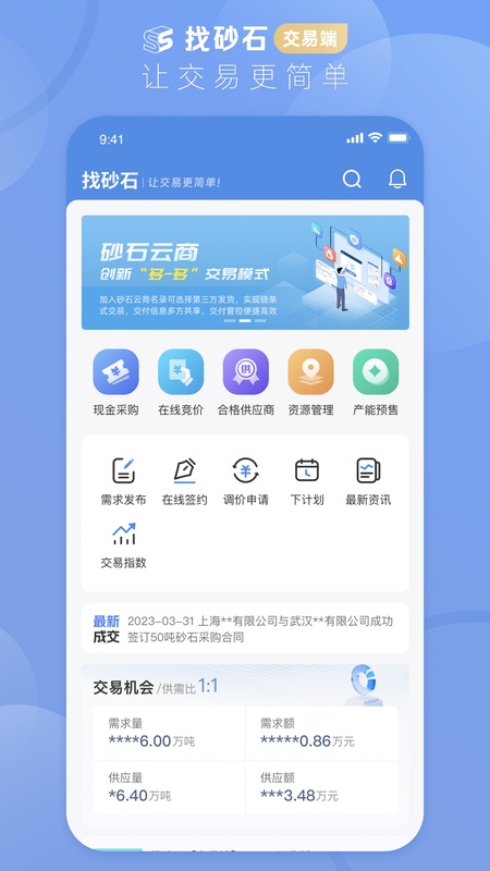 找砂石软件以“让交易更简单”为使命,为砂石建材交易全链条赋能。其构建了“互联网 + 砂石建材”的产业链服务体系,当前提供丰富的交易服务功能。包括交易大厅的摘挂牌功能,用户可在此便捷进行交易操作;在线询价功能让用户快速了解价格信息;资源地图方便用户查找相关资源;在线签约实现高效签约流程;一键对账功能使账目核对变得轻松;实时结算保障资金流转及时;还有供应链金融服务助力企业资金周转;智能交付功能确保货物交付的顺畅。从交易开始到结算完成,始终秉持安全、高效、简单的原则,解决用户交易难题。
