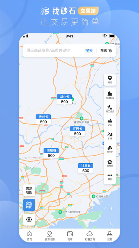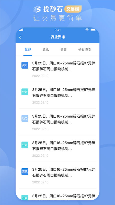 找砂石以“让交易更简单”为使命赋能砂石建材交易全链条,旨在建立“互联网+砂石建材”的产业链服务体系,构建并发展价值共享、行业共赢的砂石行业生态圈。目前主要提供交易服务功能,通过交易大厅(摘挂牌)、在线询价、资源地图、在线签约、一键对账、实时结算、供应链金融、智能交付等功能,为用户提供简单高效的交易服务,从开始交易到完成结算,秉持安全、高效、简单的原则,为用户解决交易难题,真正实现简单交易 软件功能