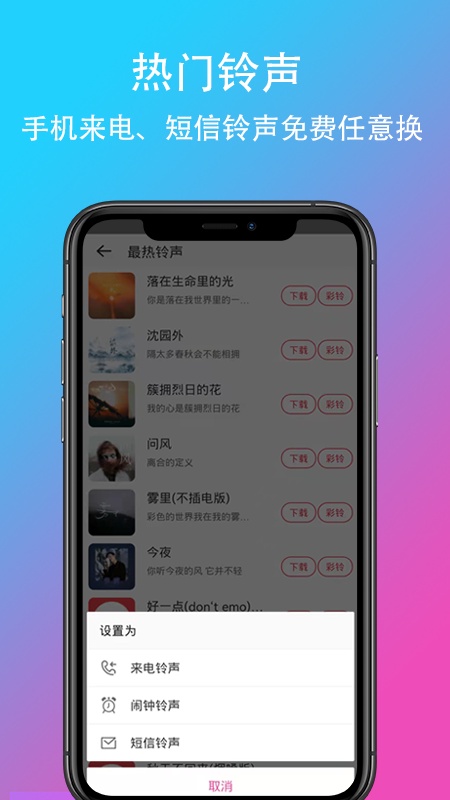 • 铃声多多:高清音质铃声,覆盖qq音乐、网易云音乐、酷狗音乐、咪咕音乐等曲库