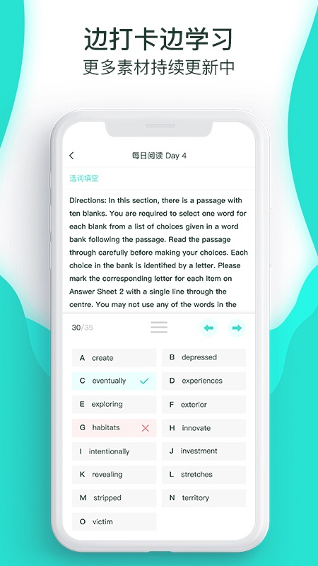 • 丰富的内容素材——平台新增四六级冲刺内容,可通过目标打卡完成每日单词记忆与真题练习,更多与挑战主题相匹配的内容将在未来持续扩充,让目标不再只是一句标题!