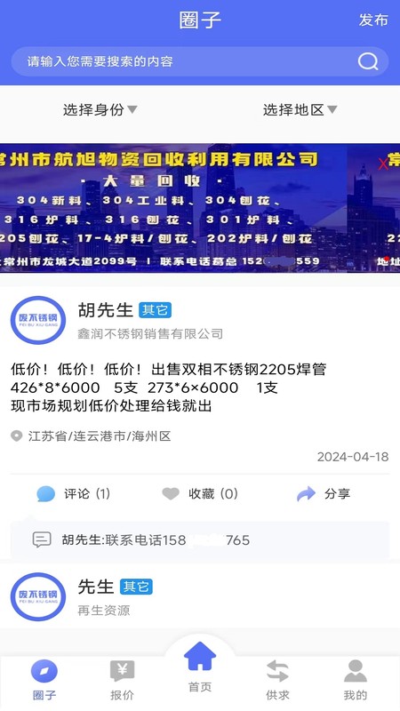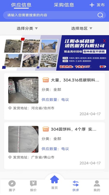 【废不锈钢信息平台】是一款可线上对接生意 寻找货源信息 查看全国基地报价可直接联系基地采购部 每天及时更新货源和报价 还提供废不锈钢人员的交流圈子 同微信朋友圈一样 可发布个人以及公司需求 圈子供求信息上方 设有广告位 可推广个人及公司信息介绍
