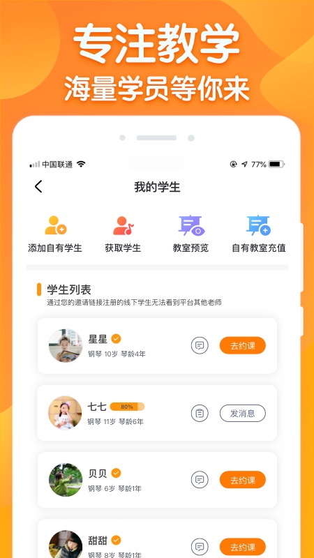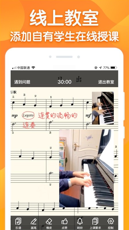 来音练琴是一个线上乐器陪练平台,老师可以在平台接受学生的约课,也可以邀请自己原有的学生到平台上课。对于平台老师: