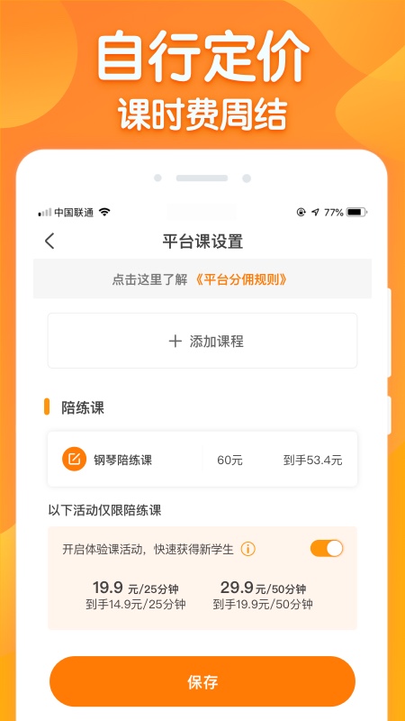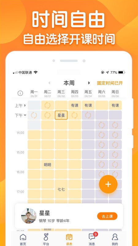 【时间自由】平台管理人性化,老师自由选择排课时间,不强制开课。 软件功能
