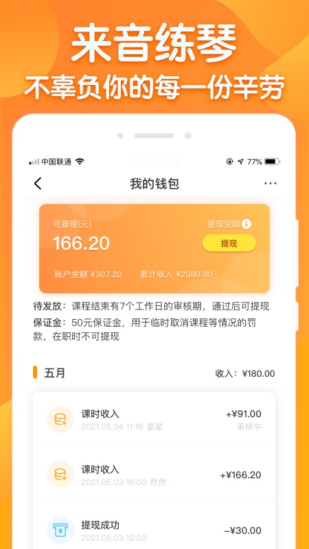来音练琴是一个线上乐器陪练平台,其主要功能包括老师可在平台接受学生约课,还能邀请自己原有的学生到平台上课。平台拥有百万学员规模,学生可自主约老师的课。老师能够自定课时费,并且工资周结。同时,平台管理人性化,老师可自由选择排课时间,不强制开课。